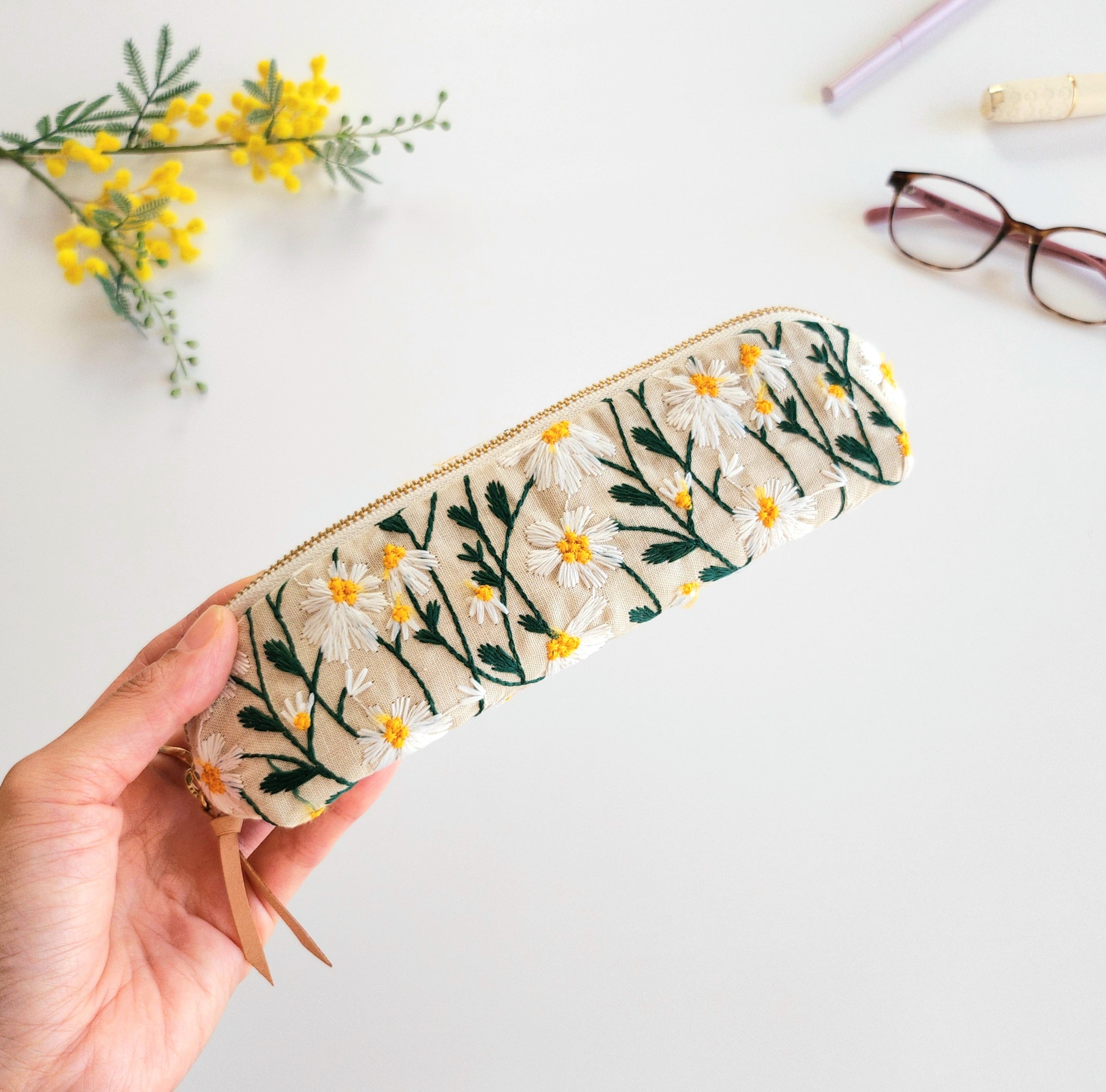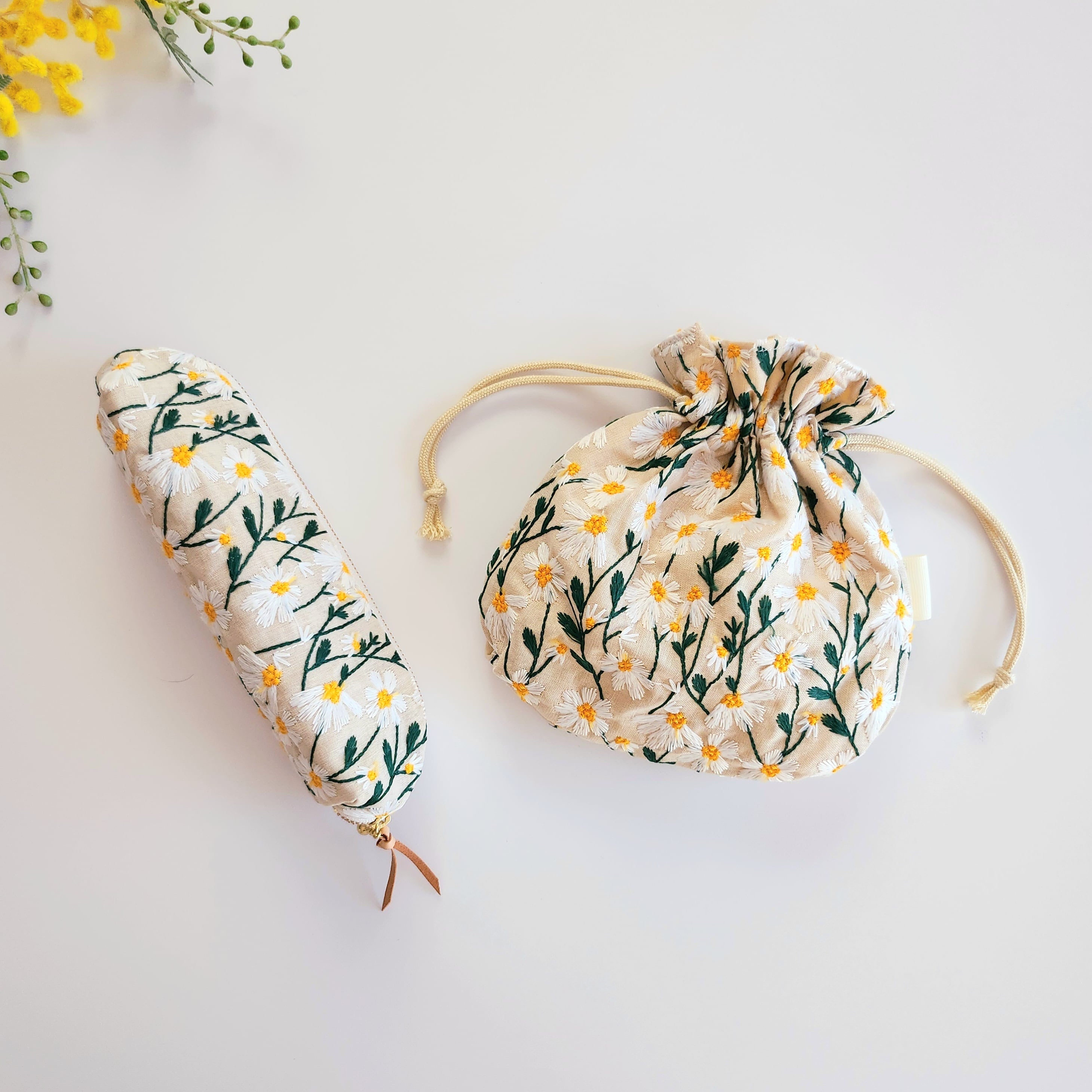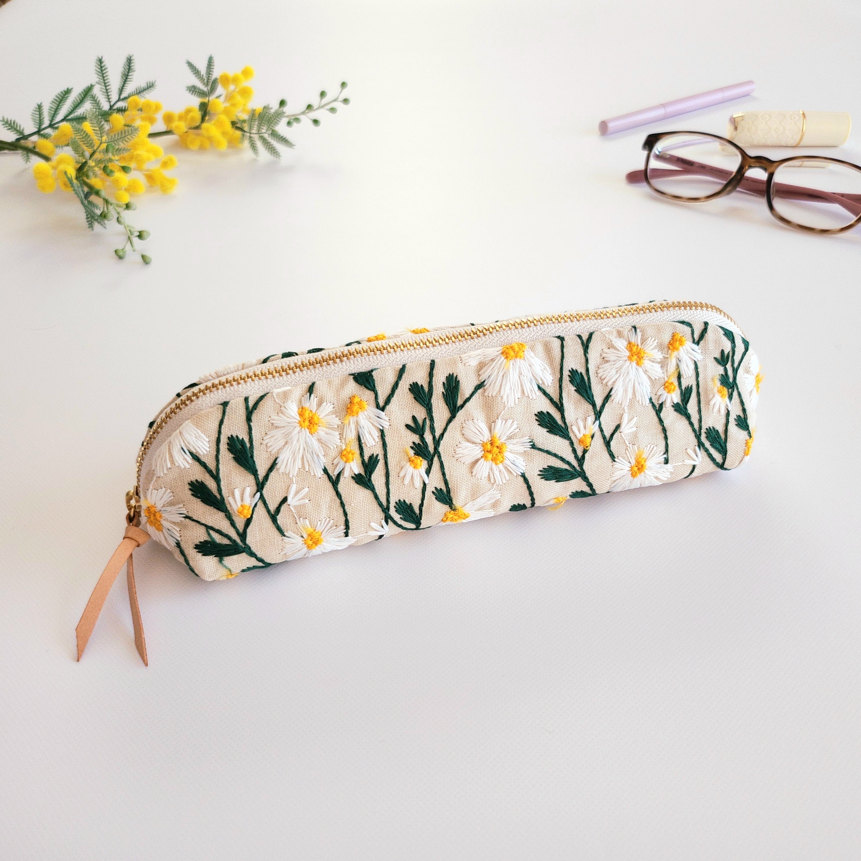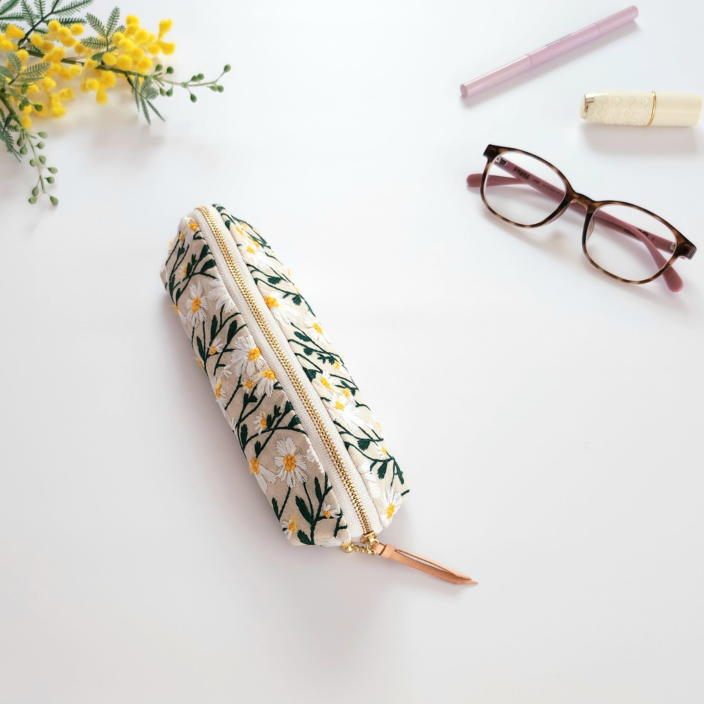 デイジー刺繍のメガネケース/ペンケース/ロングポーチ│花柄 ラミネート クリスマスギフト