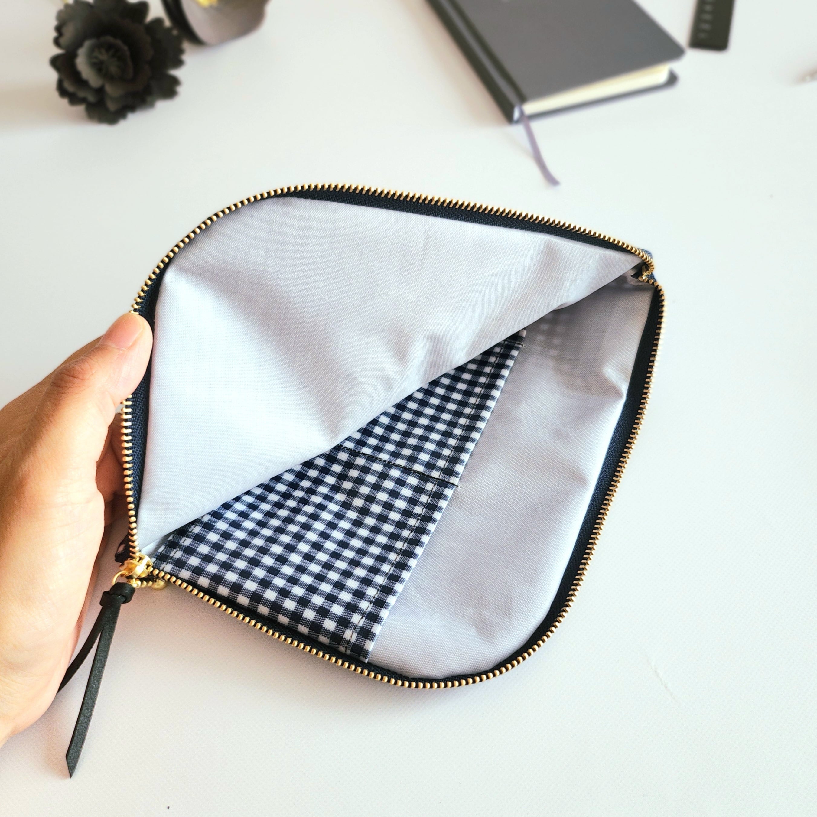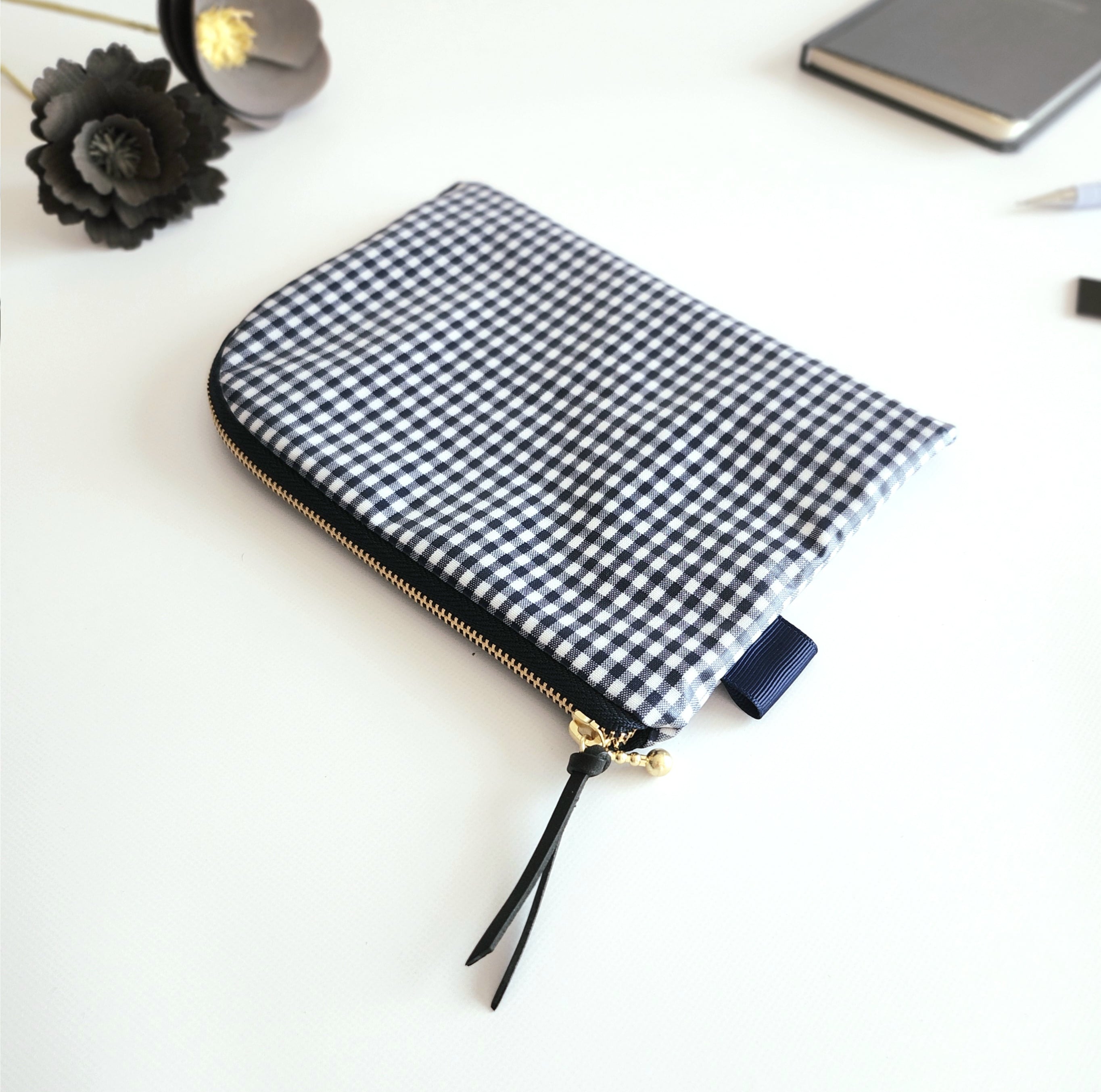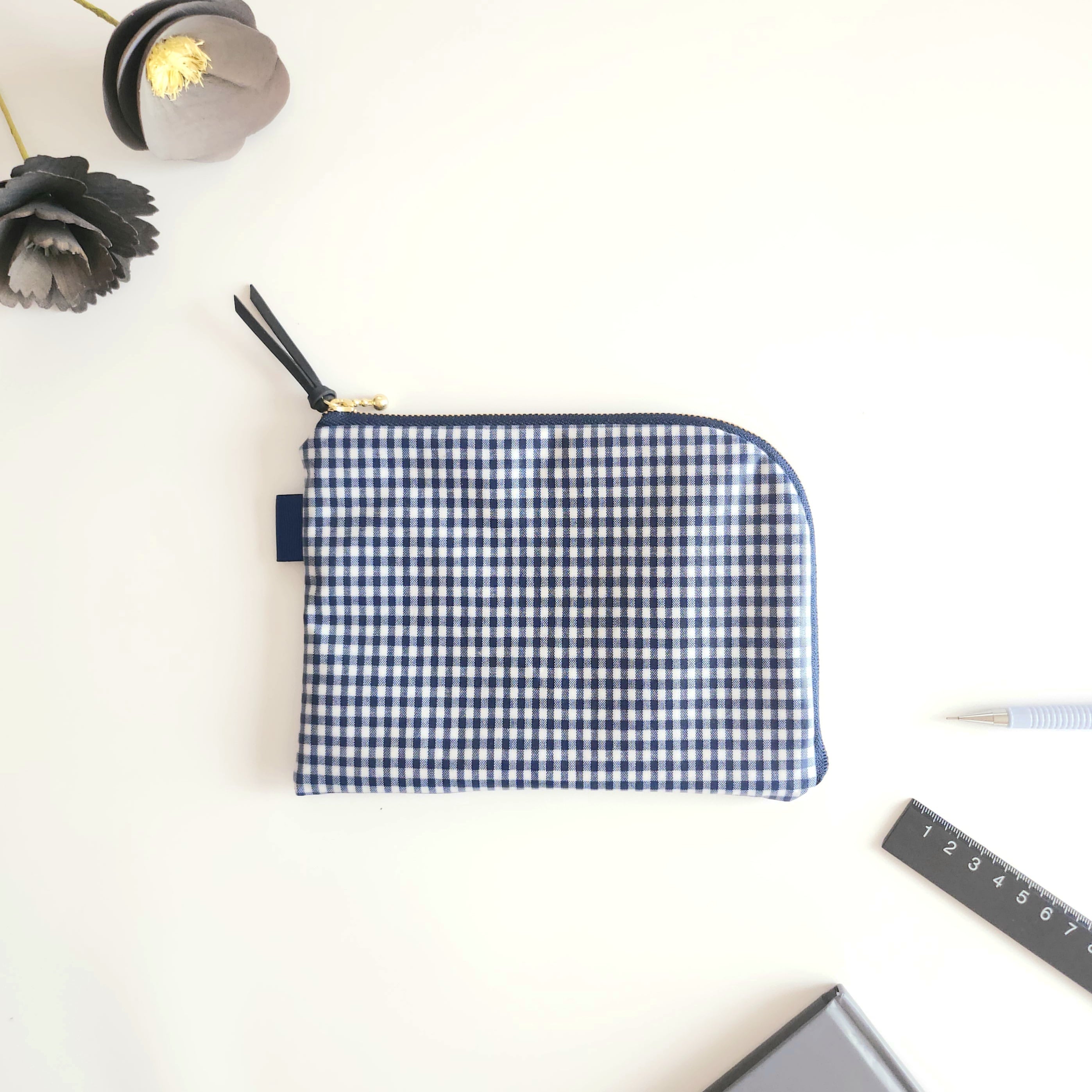 ダークネイビーギンガムチェックのL字ファスナーポーチ/母子手帳ケース/フラットポーチ│ラミネート 撥水