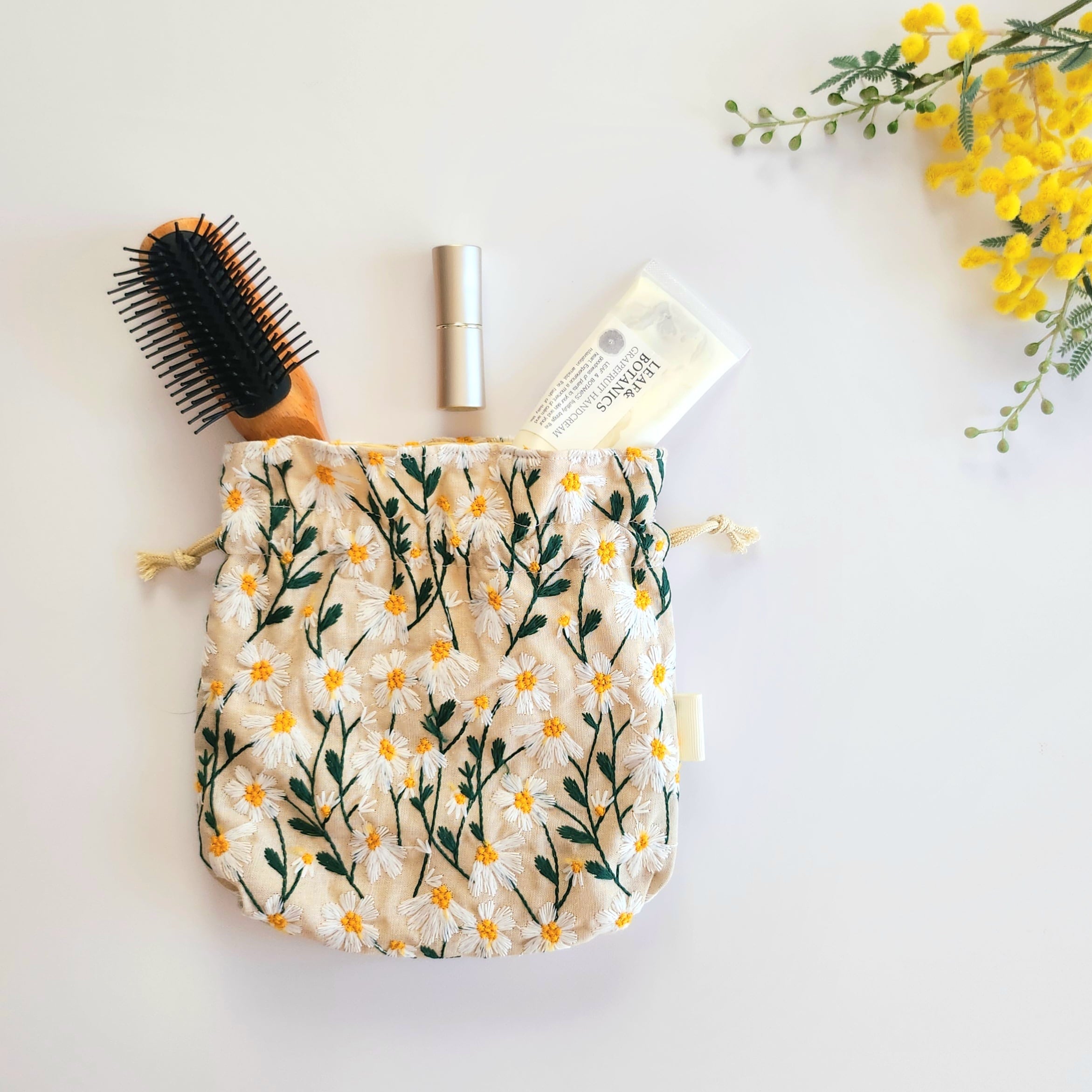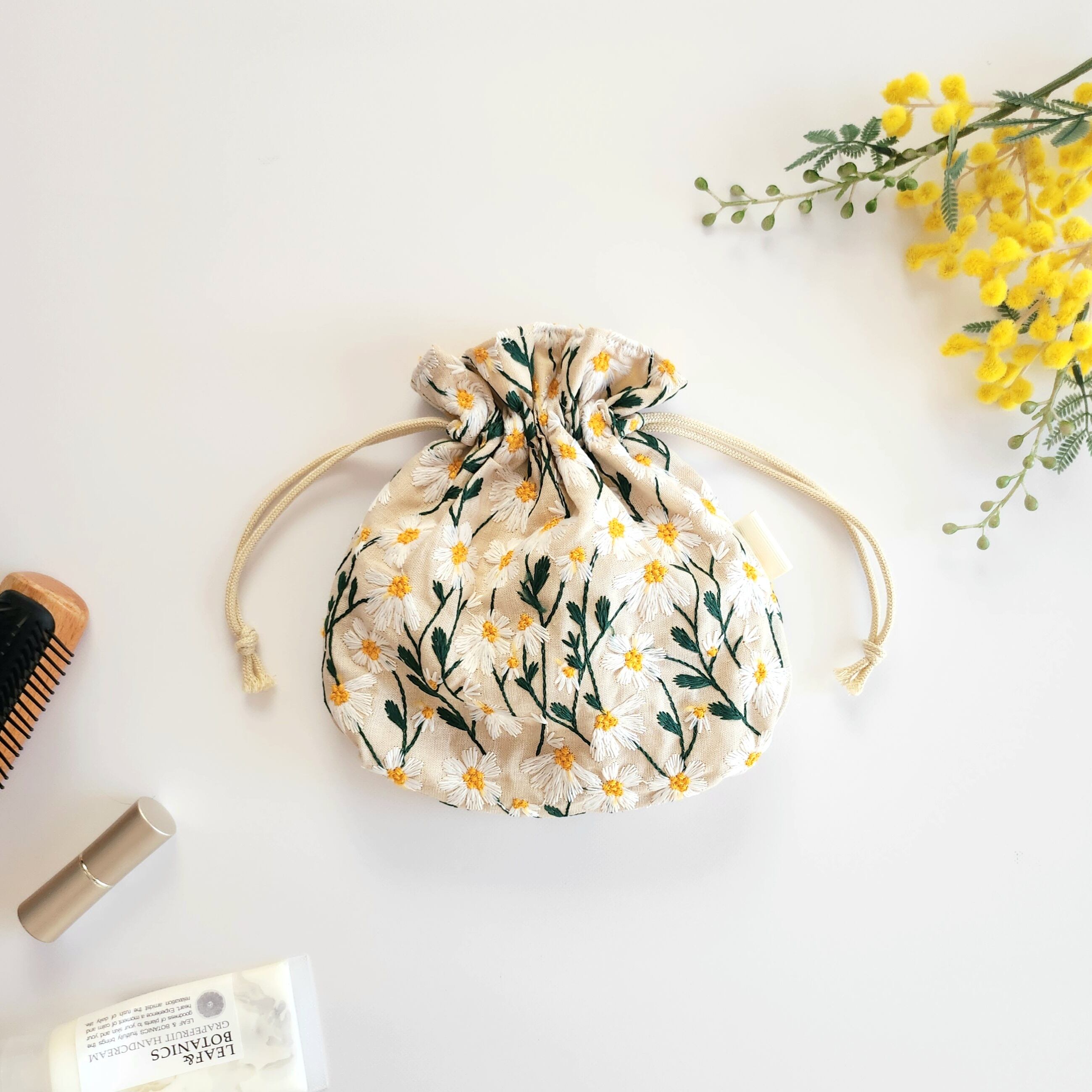 デイジー刺繍のふんわりまぁるい巾着ポーチ│巾着袋│ギフト クリスマス ミモザ
