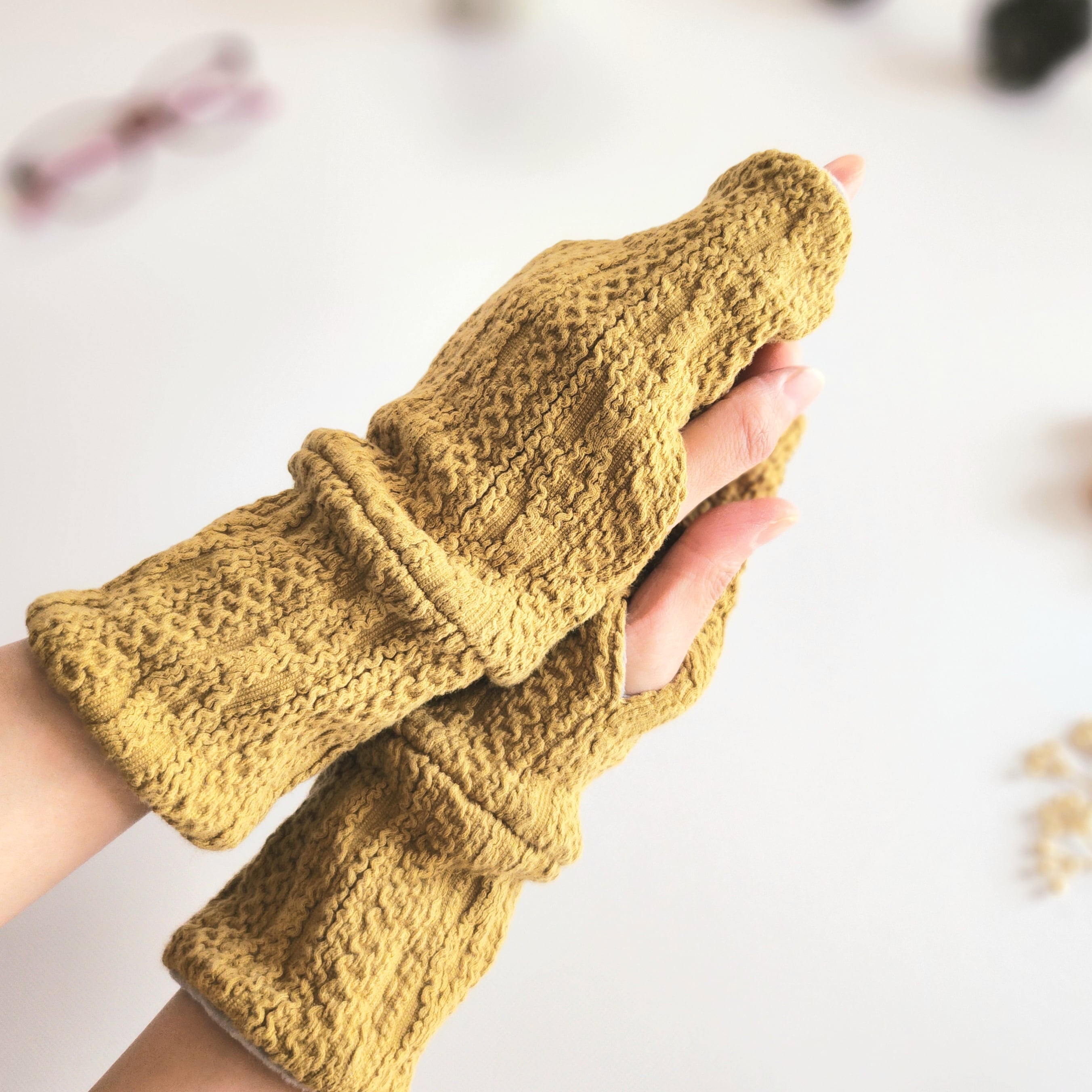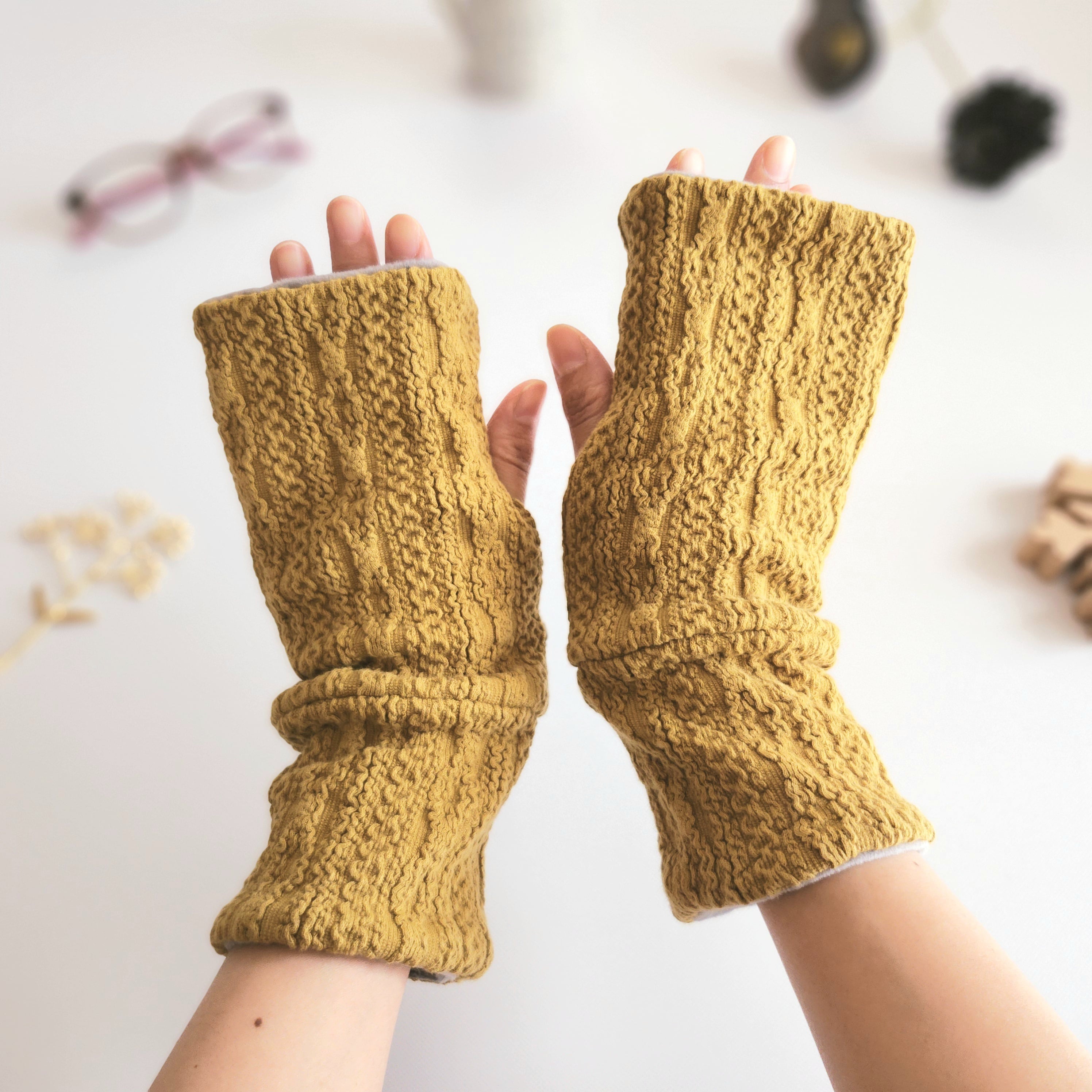 もちもち、暖か。アランニット×もちもちボアのハンドウォーマー│アームウォーマー│手袋【マスタード】