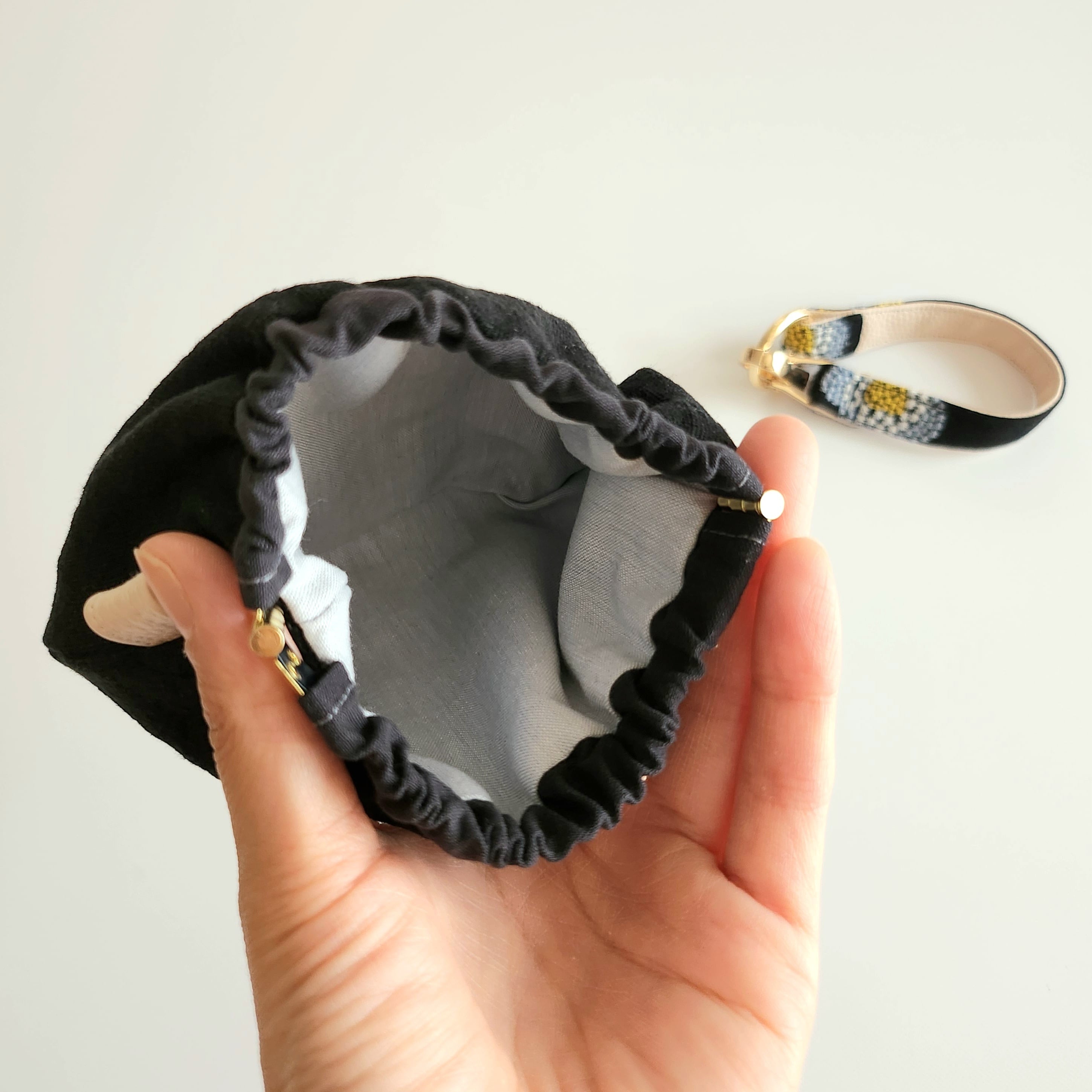 ふんわりまあるいバネ口ポーチ・ストラップ付【BIGなお花刺繍】カラビナ スマホストラップ ギフトに