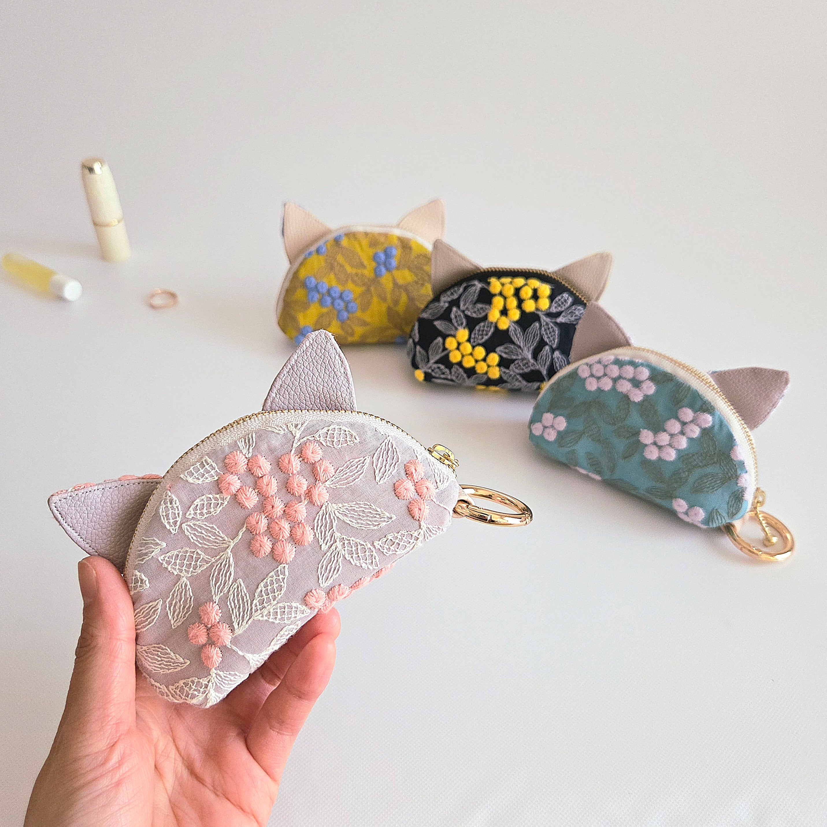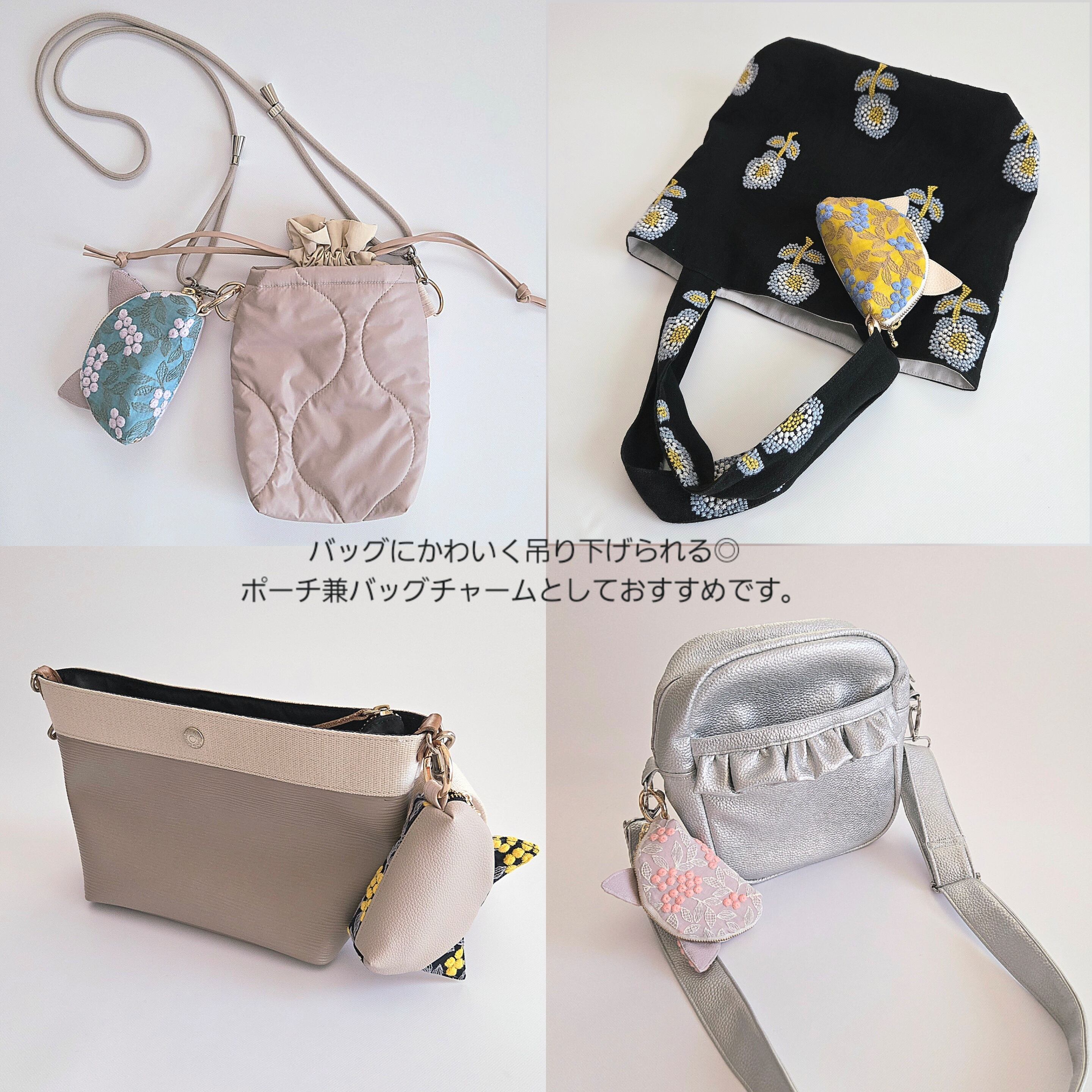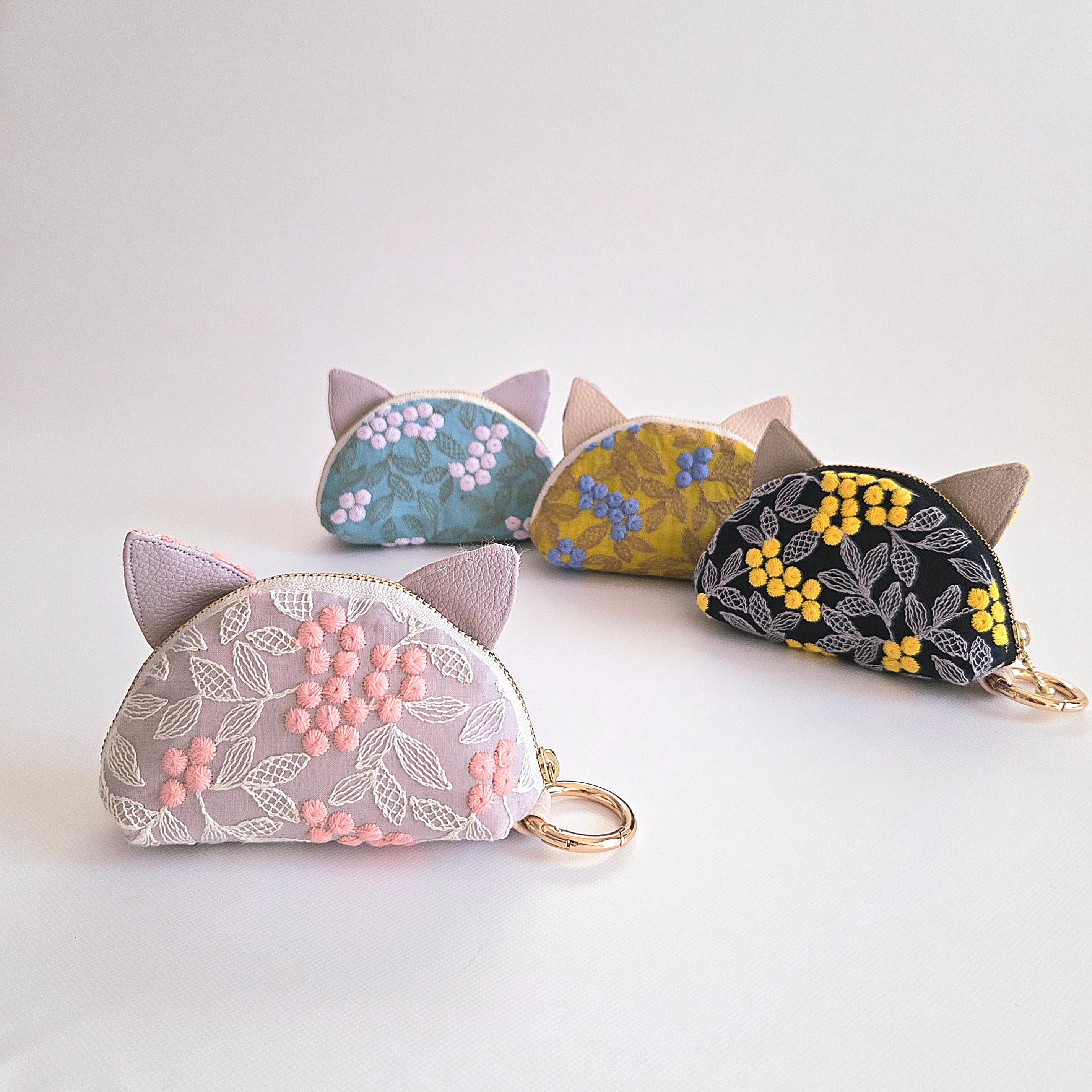ぷくまる刺繍×フェイクレザーの異素材ミックスで、4つのカラーのにゃんともかわいい猫耳ポーチが出来ました◎
