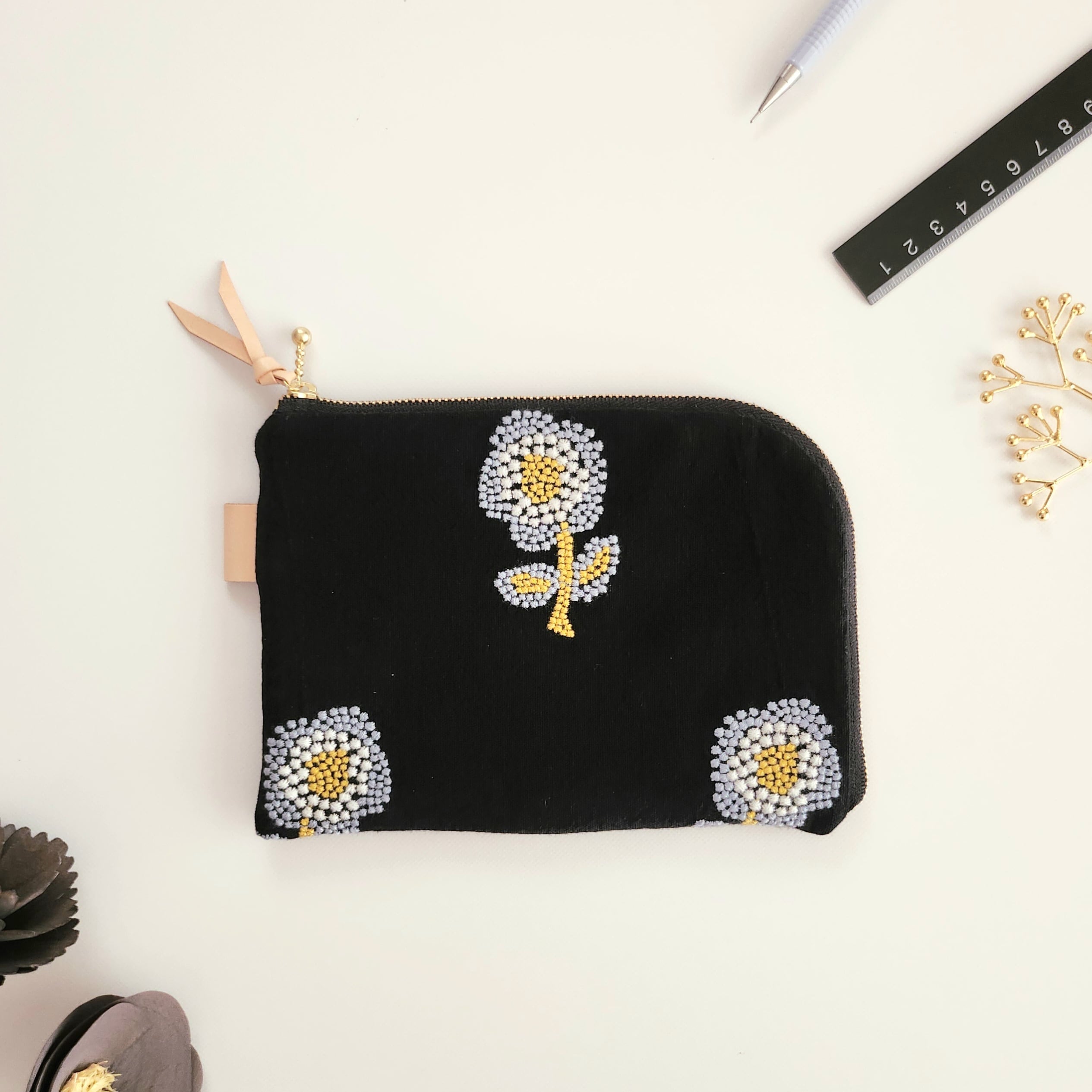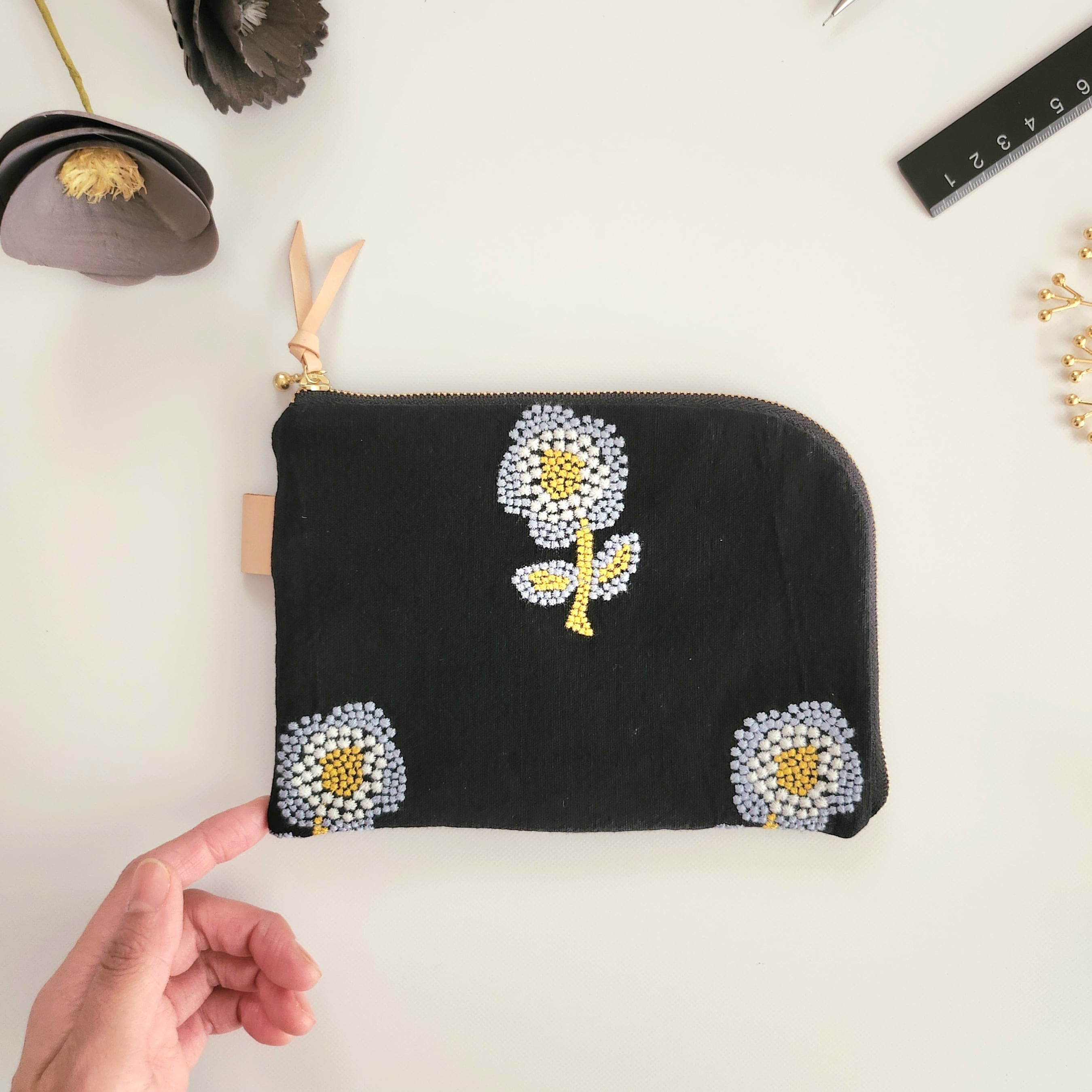 BIGなお花刺繍のL字ファスナーポーチ/フラットポーチ/母子手帳ケース│ブラック