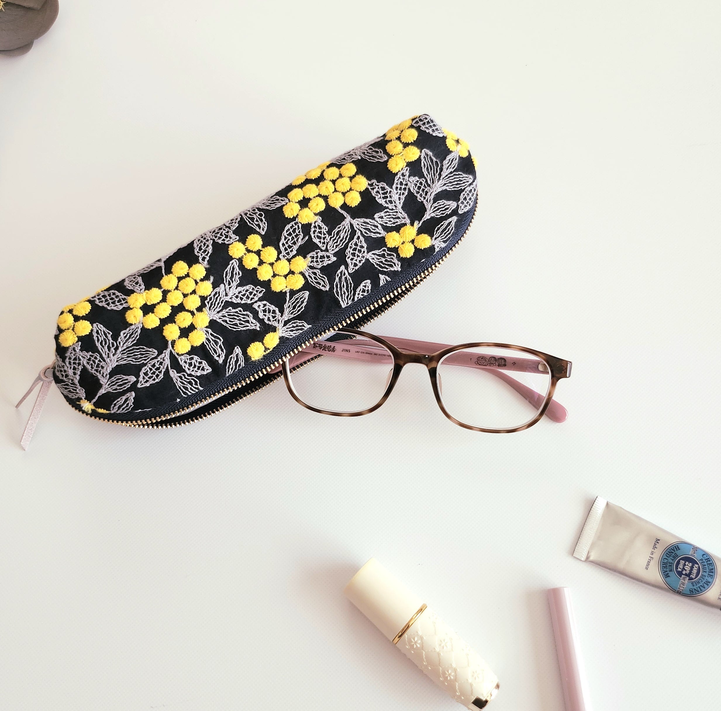 ぷくまる刺繍のパカッと開くロングポーチ│ペンケース│メガネケース【ネイビー】