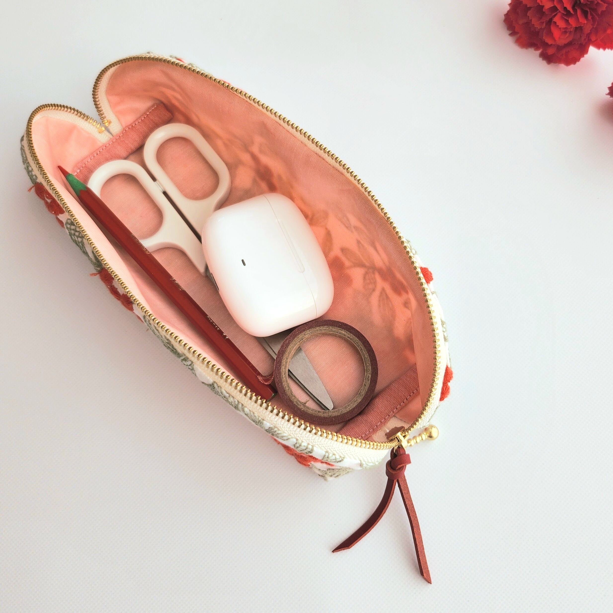 ぷくまる刺繍のパカッと開くロングポーチ│ペンケース│メガネケース【オフホワイト×レッド】